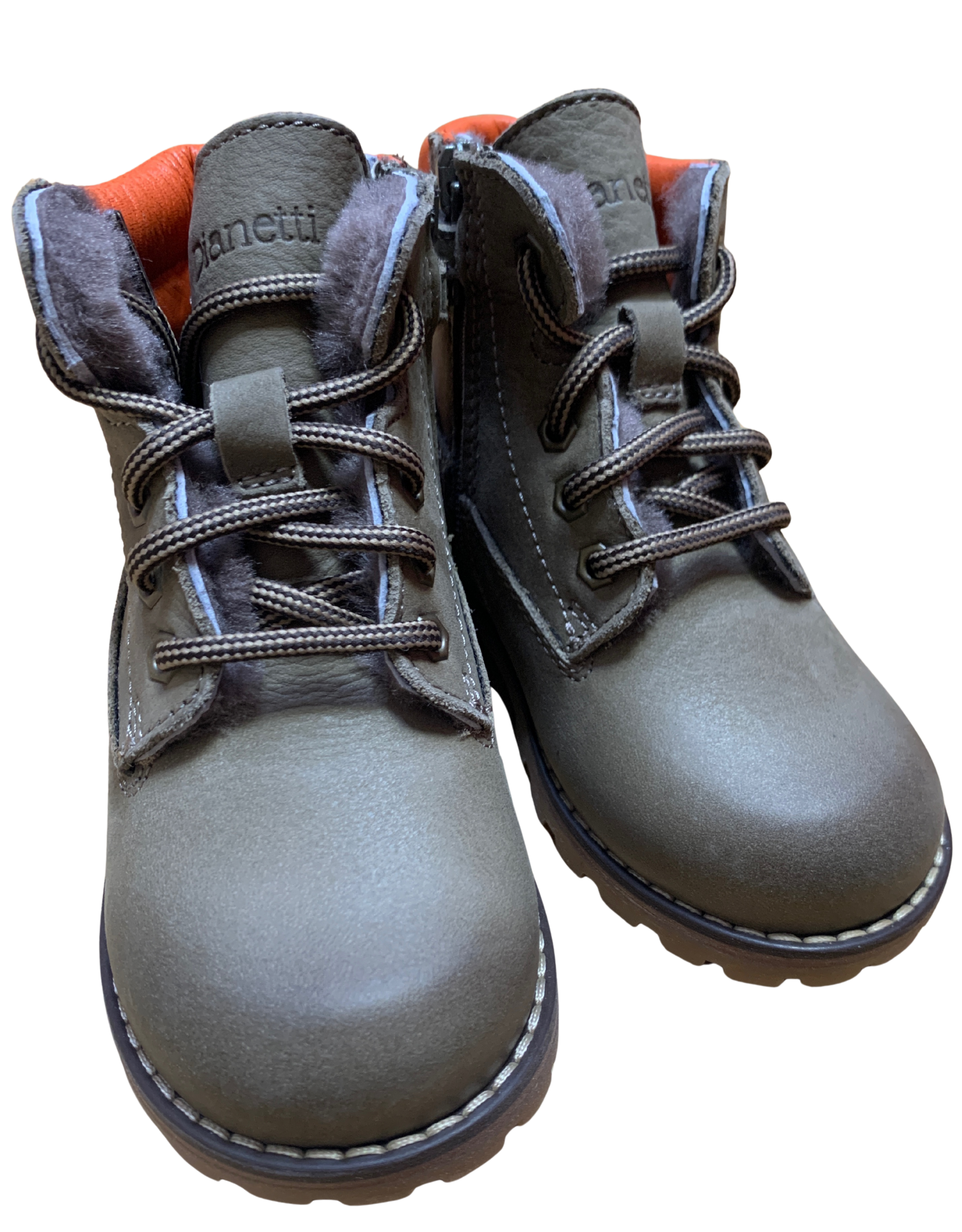Winterstiefel von Dianetti für Jungen – aus Leder mit Lammfellfutter Diese hochwertigen Winterstiefel von Dianetti vereinen stilvolles Design mit wärmendem Komfort. Aus glattem Olivleder gefertigt und hinten mit einem auffälligen orangefarbenen Akzent versehen, bringen sie eine sportlich-moderne Note in jedes Winteroutfit. Das echte Lammfellfutter sorgt für kuschelige Wärme, während der seitliche Reißverschluss das An- und Ausziehen erleichtert. Zusätzlich sind zwei Paar Schnürsenkel im Set enthalten – für einen individuell anpassbaren Look. Mit ihrer robusten Sohle und der bequemen Passform sind diese hohen Sneaker-Stiefel der perfekte Begleiter für kalte Tage – stylisch, warm und funktional.